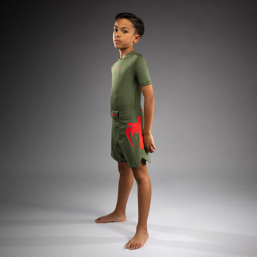Бійцівські шорти Venum Light Kids Fightshorts Army Green Orange — незамінний елемент екіпірування в гардеробі юних спортсменів.