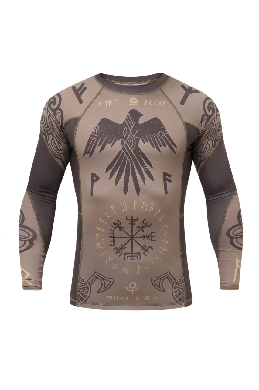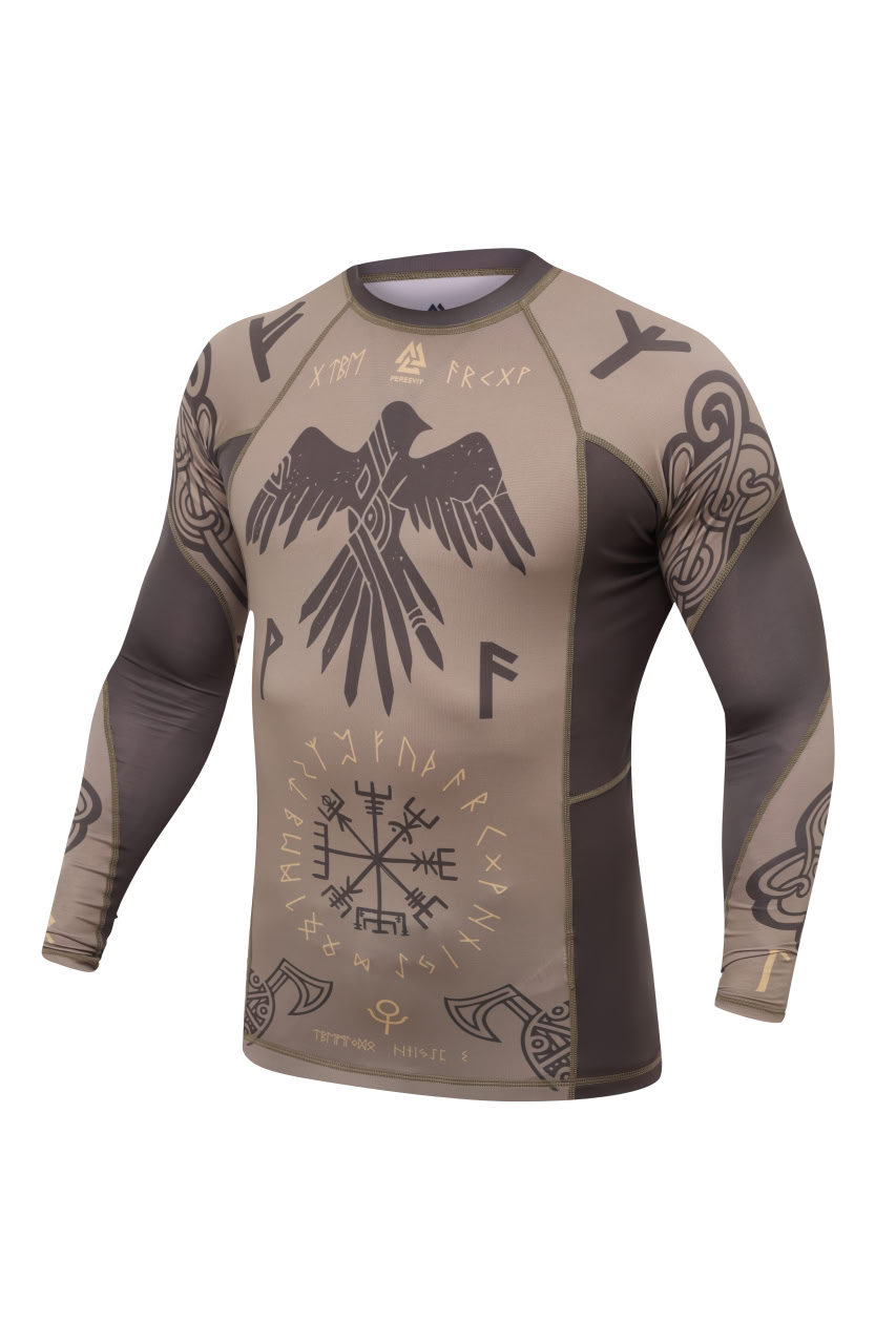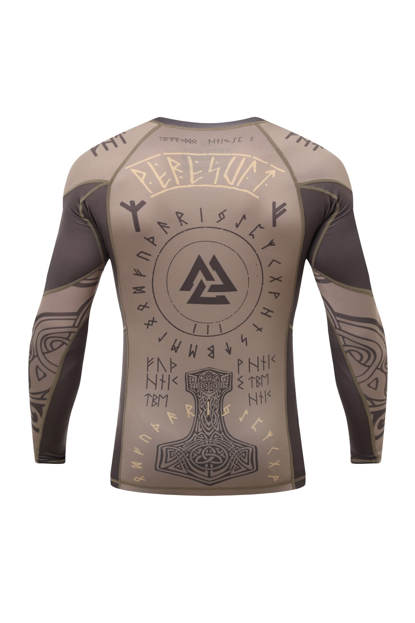 Peresvit Valhalla Rashguard Long Sleeve Ash Brown — a compression long sleeve rashguard for MMA, grappling and wrestling. Tight fit, reinforced seams, sublimated design. Premium quality, distinctive style.